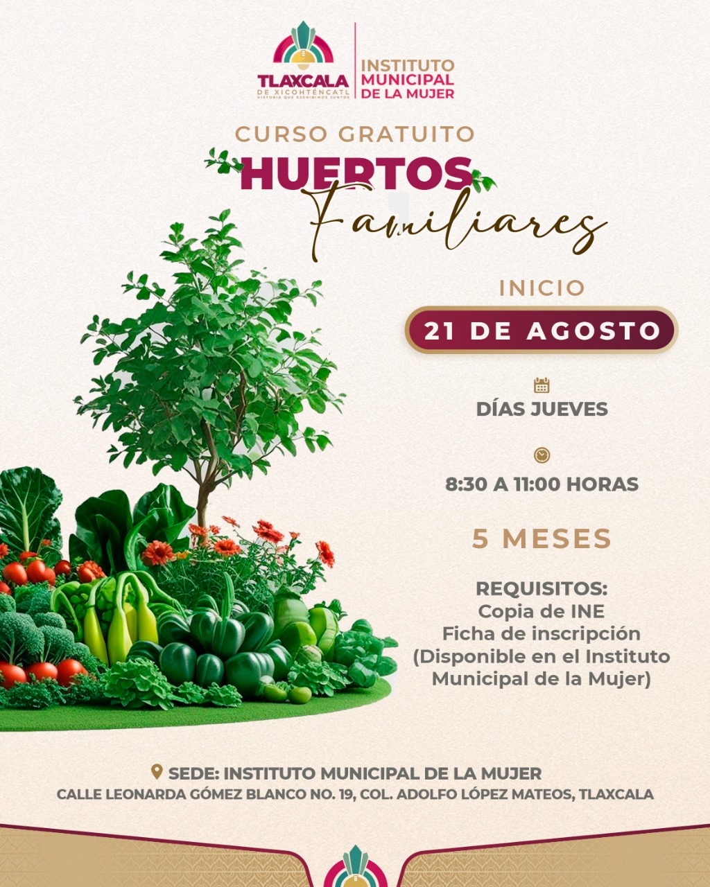En una acción más para fortalecer la economía familiar y promover el empoderamiento de las mujeres de la capital, el Ayuntamiento de Tlaxcala, que Preside Alfonso Sánchez García, a través del Instituto Municipal de la Mujer, invita al curso gratuito de Huertos Familiares, que iniciará el 21 de agosto próximo y tendrá una duración de cinco meses.