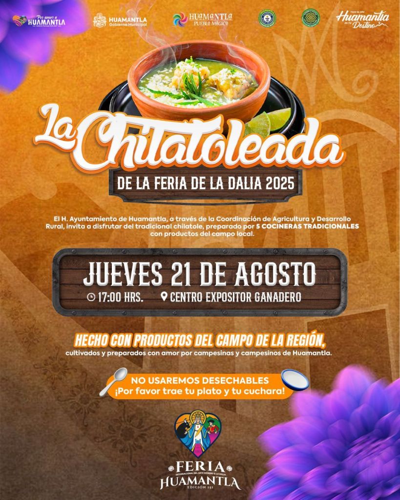 Huamantla, Tlaxcala — Como parte de las actividades gastronómicas y culturales de la Feria Internacional del Arte Efímero y la Dalia Huamantla 2025, el Gobierno Municipal invita a toda la ciudadanía y visitantes a disfrutar de la ya tradicional Chilatoleada, que se llevará a cabo el próximo jueves 21 de agosto a las 17:00 horas en el Centro Expositor Ganadero.