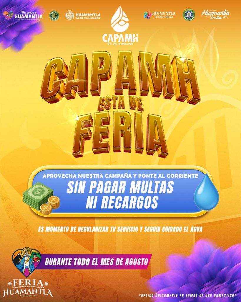Huamantla, Tlax., — En el marco de las celebraciones por la tradicional feria de Huamantla, la Comisión de Agua Potable y Alcantarillado del Municipio de Huamantla (CAPAMH) ha puesto en marcha una campaña especial de condonación de multas y recargos, con el objetivo de facilitar a la ciudadanía la regularización de sus servicios de agua potable.