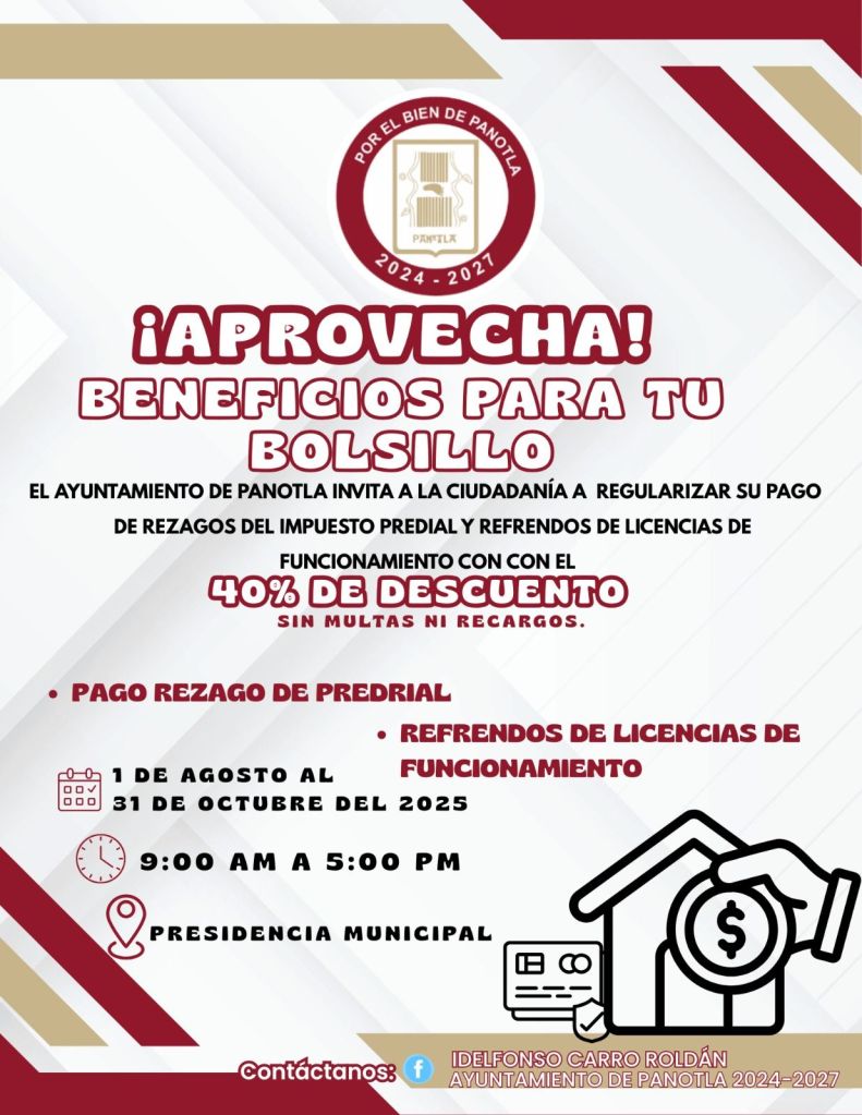 Con el objetivo de apoyar la economía familiar y fomentar la regularización de contribuyentes, el H. Ayuntamiento de Panotla, a través de la Dirección de Ingresos, anuncia la puesta en marcha de la campaña “Descuentos a Rezagos de Ejercicios Anteriores a Predio y Refrendos de Licencias de Funcionamiento” para negocios comerciales del municipio.