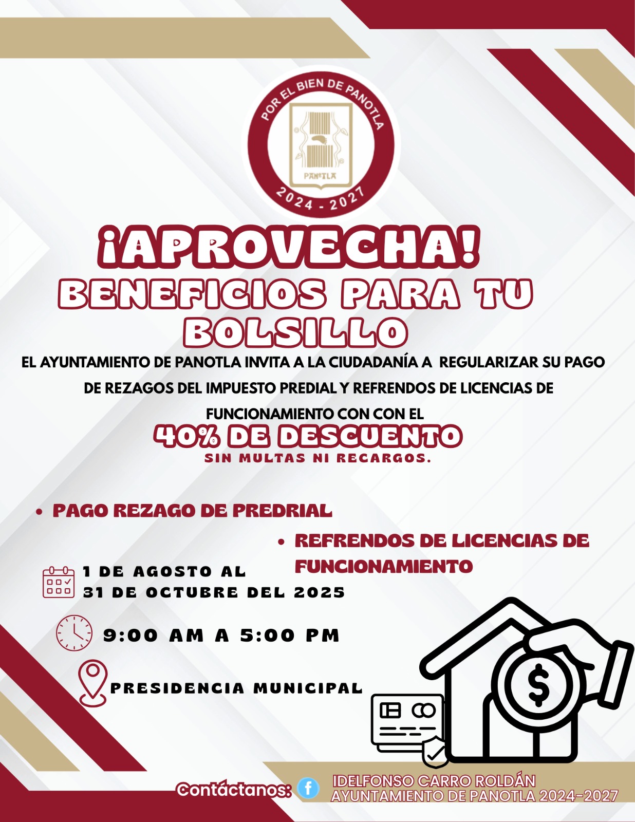 Esta iniciativa, que estará vigente del 1 de agosto al 31 de octubre de 2025, ofrece a los contribuyentes la oportunidad de gozar de un 40% de descuento en rezagos y de la condonación total de multas y recargos en refrendos de licencia de funcionamiento.