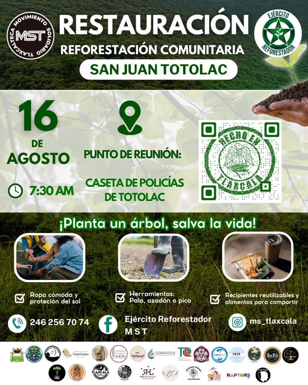 El M S T y Ejército Reforestador te invitan a la 𝗷𝗼𝗿𝗻𝗮𝗱𝗮 𝗱𝗲 𝗿𝗲𝗳𝗼𝗿𝗲𝘀𝘁𝗮𝗰𝗶ó𝗻 el día de mañana en punto de las 7:30 am, el punto de reunión es en la Dirección de Seguridad Pública de Totolac (zona de estacionamientos).