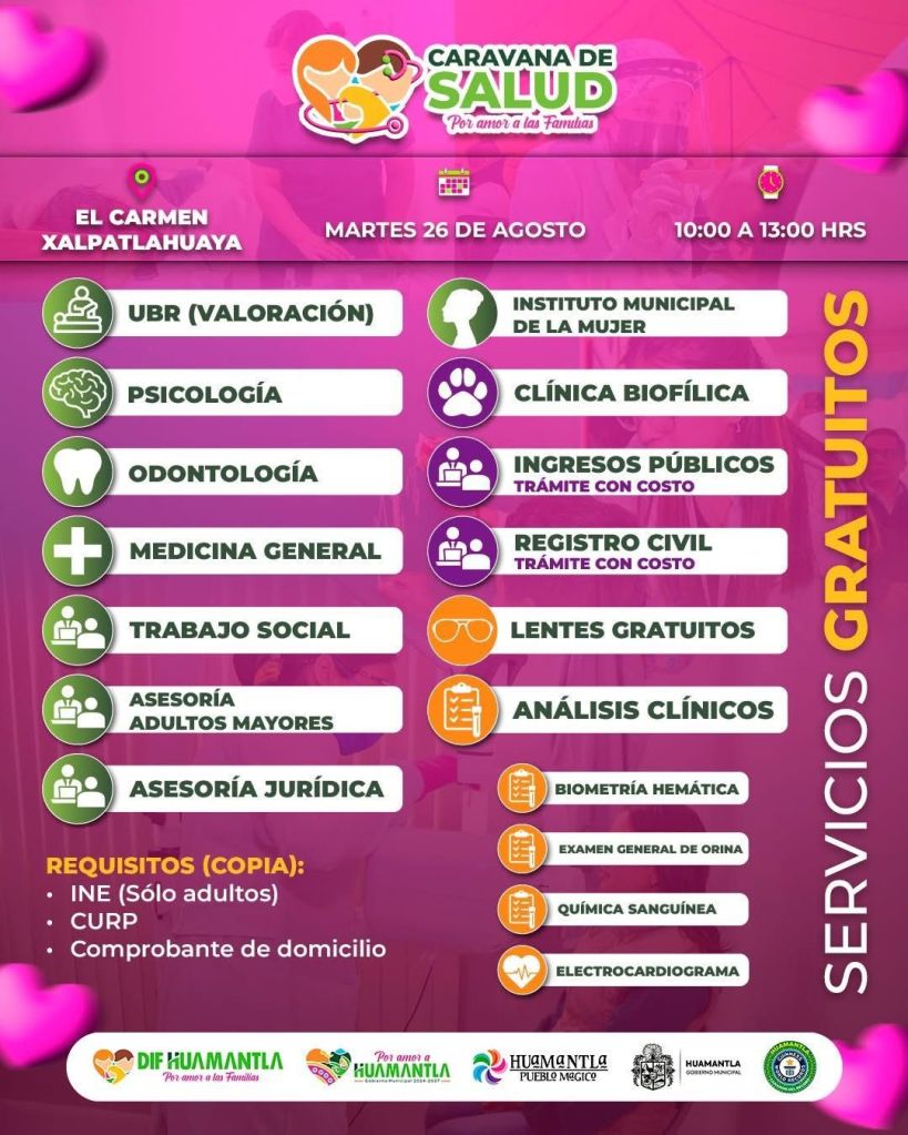 Con el objetivo de acercar servicios esenciales y mejorar la calidad de vida de las familias huamantlecas, el Gobierno Municipal de Huamantla, que encabeza Salvador Santos Cedillo, a través del Sistema DIF Municipal, llevará a cabo este martes 26 de agosto una jornada más de la Caravana de Salud y Servicios en la comunidad de El Carmen Xalpatlahuaya.