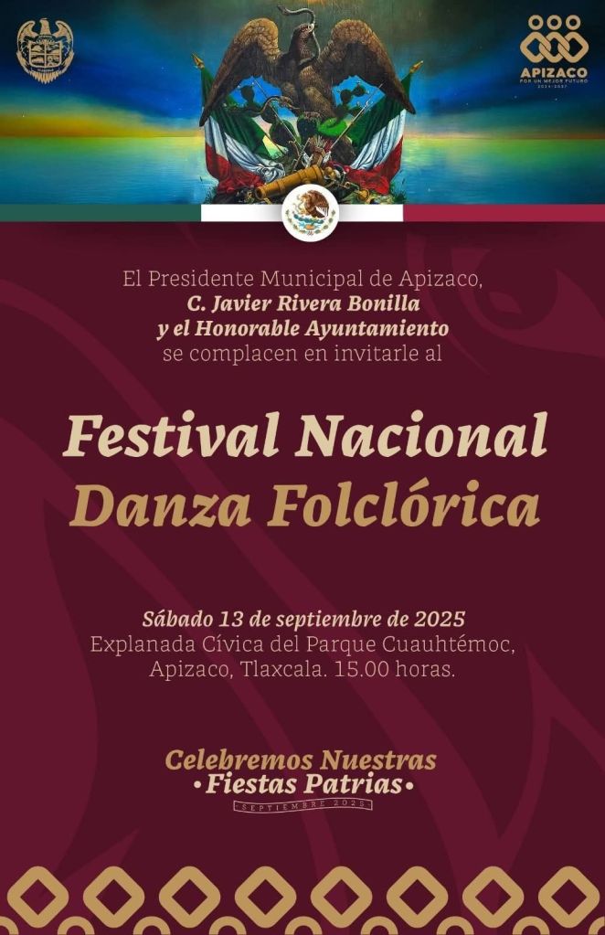 El H. Ayuntamiento de Apizaco, que encabeza el presidente municipal Javier Rivera Bonilla, invita cordialmente a toda la ciudadanía a disfrutar del Festival Nacional de Danza Folclórica, un espacio donde la música, el color y nuestras raíces se unen para celebrar con orgullo la riqueza cultural de México. 🇲🇽💃🕺