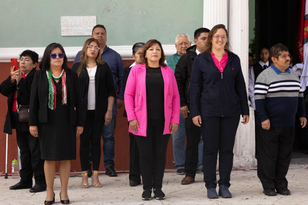 La escolta de la Escuela Primaria “Justo Sierra” realizó el recorrido de la bandera de Tlaxcala para rendir honores al Lábaro Patrio, mientras el presidente de comunidad entonó el Himno a Tlaxcala.