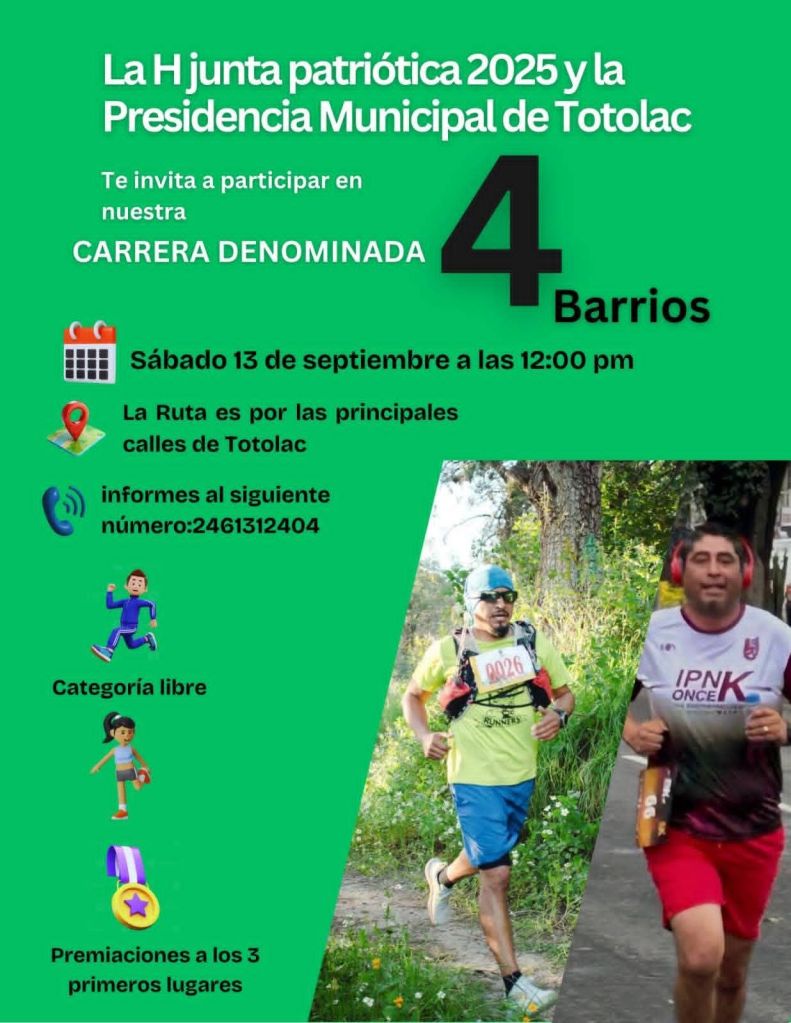 La H. Junta Patriótica 2025 y el Gobierno Municipal de Totolac 24-27 te invitan a la Gran Carrera Denominada 4 Barrios en su primera edición.