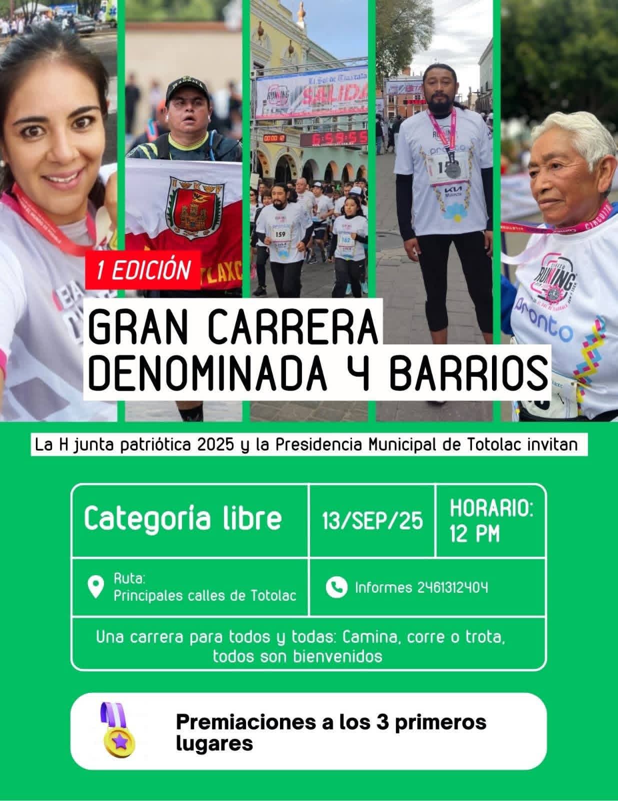 La H. Junta Patriótica 2025 y el Gobierno Municipal de Totolac 24-27 te invitan a la Gran Carrera Denominada 4 Barrios en su primera edición.