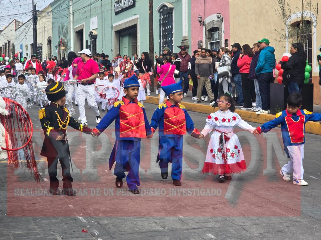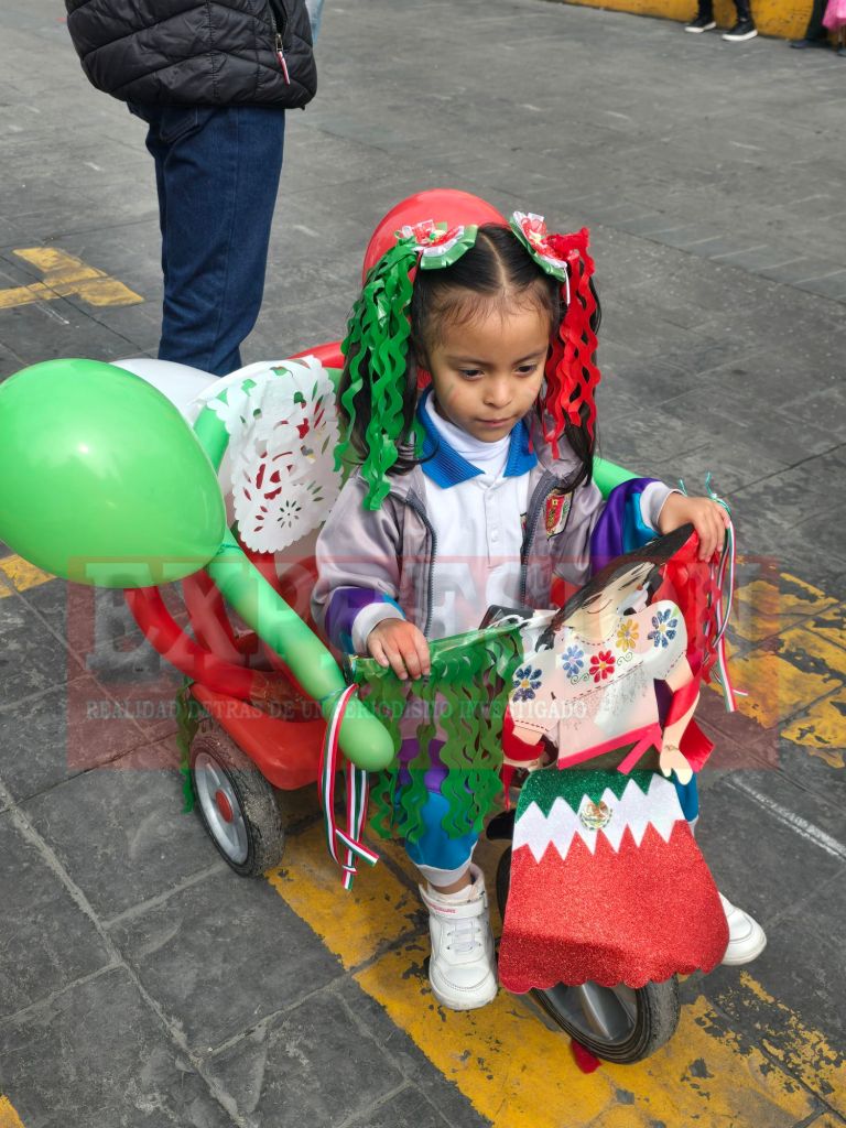 Con banderitas, trajes típicos y representaciones alusivas a la historia de México, los pequeños estudiantes recorrieron las principales calles de Huamantla acompañados de sus maestros y padres de familia, quienes aplaudieron y alentaron su participación.