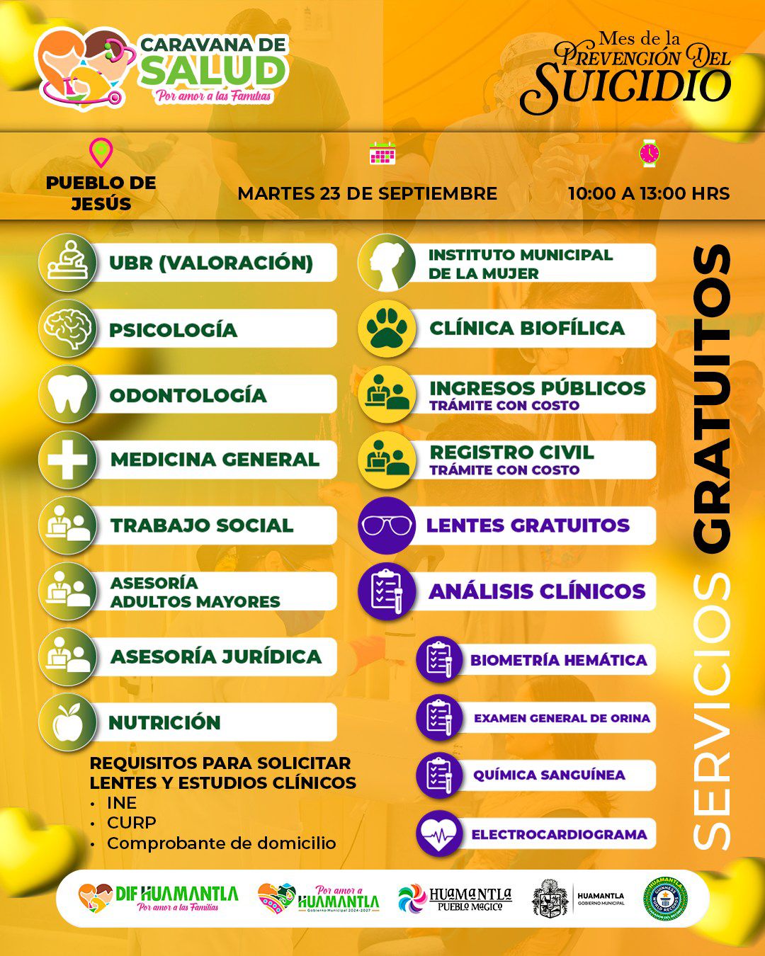 El Gobierno Municipal de Huamantla, a través del Sistema Municipal DIF invita a la ciudadanía a participar este martes 23 de septiembre, de 10:00 a 13:00 horas, se llevará a cabo la Caravana de Salud “Por amor a las familias” en el Pueblo de Jesús, con el propósito de acercar servicios médicos y de asistencia social a las familias de esta comunidad y zonas aledañas.