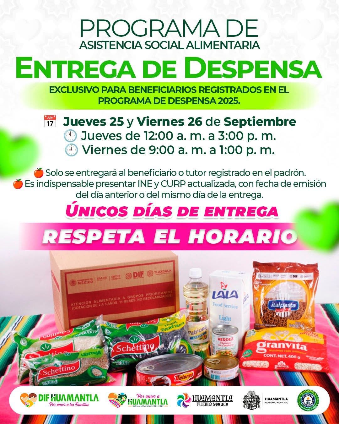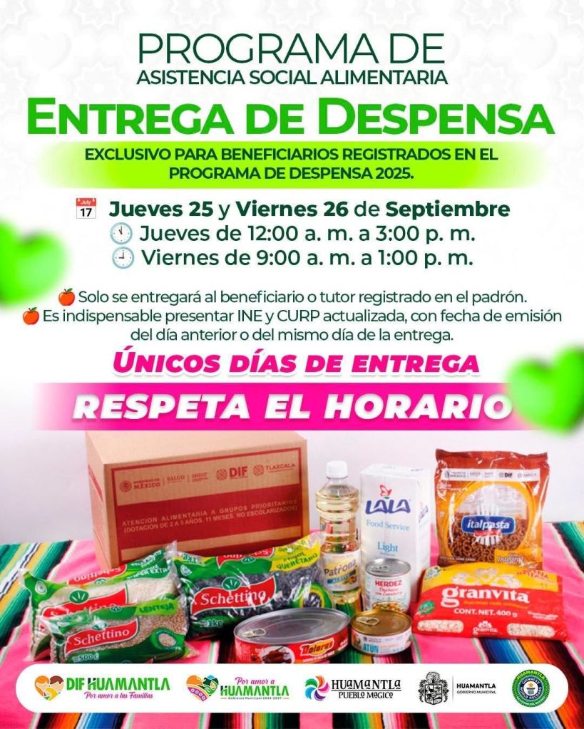 El Sistema Municipal para el Desarrollo Integral de la Familia (SMDIF) Huamantla informa a las y los beneficiarios del Programa de Asistencia Social Alimentaria que la entrega de despensas correspondientes al mes de septiembre se realizará los días jueves 25 y viernes 26 de septiembre, únicamente para las personas registradas en el padrón 2025.