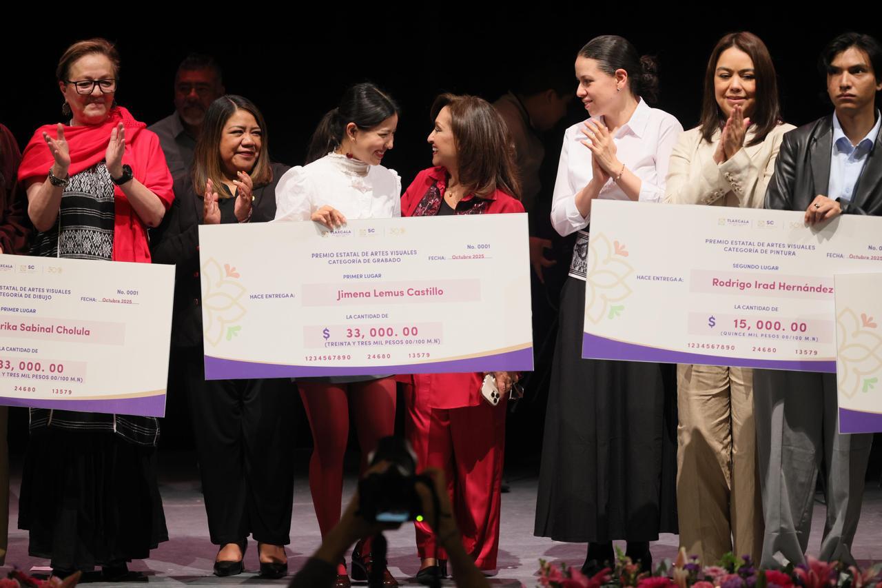 En el Teatro Xicohténcatl, los galardonados de los Premios Tlaxcala de Artes Visuales fueron ovacionados. El primer lugar en la categoría de dibujo fue Erika Sabinal Cholula, por su obra “Retrato, analogía sobre el mural de la batalla”. El segundo lugar lo obtuvo Óscar Leonardo González Flores, con “Herencia: Lozanía y declive”.