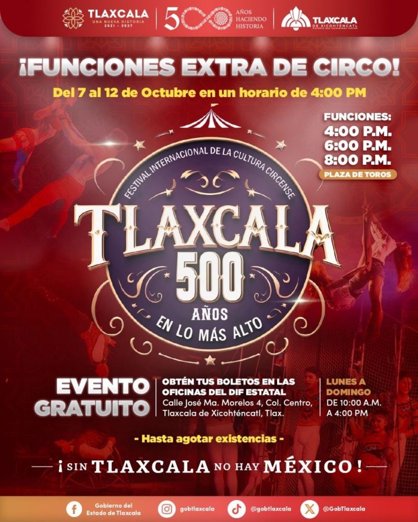 El Gobierno del Estado anunció que, a partir de este 7 de octubre, se realizarán funciones adicionales a las 16:00 horas del Festival Internacional de la Cultura Circense 500 Años, que tiene lugar en la Plaza de Toros Jorge “El Ranchero” Aguilar, como parte de los festejos por el medio siglo de la fundación de la ciudad de Tlaxcala.