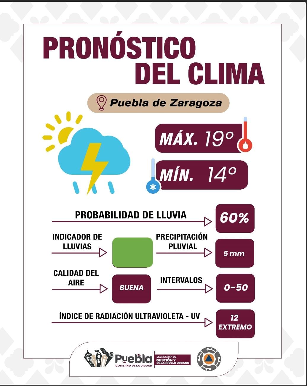 Puebla, Pue., a 09 de octubre de 2025.- El Gobierno de la Ciudad, a través del Comité de Fenómenos Hidrometeorológicos “Tlaloc” y con base en información emitida por la Comisión Nacional del Agua (CONAGUA) y el Servicio Meteorológico Nacional (SMN), informa que para este día se pronostican condiciones meteorológicas inestables en la capital. Se espera cielo mayormente nublado durante gran parte del día, con lluvias ligeras por la mañana (de 0.5 a 3 mm) y tormentas dispersas por la tarde entre las 17:00 y 19:00 horas, con una precipitación estimada de 6 a 12 mm.
