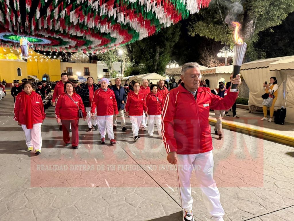 Desde la parroquia de San Luis Obispo, un contingente con familiares y personajes de quienes portaron el fuego olímpico en el 68, marcharon con la antorcha recreando el emotivo suceso, para posteriormente encender el pebetero.