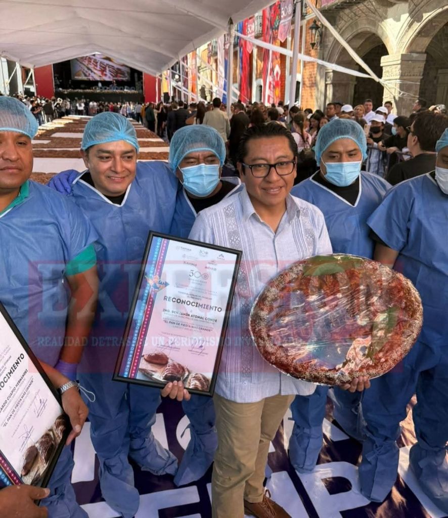 La monumental creación estuvo compuesta por más 2 mil 500 piezas de pan de fiesta, elaboradas artesanalmente por los reconocidos tahoneros de la región, quienes durante varios días trabajaron sin descanso para alcanzar esta meta que hoy coloca a Tlaxcala en los ojos del mundo.