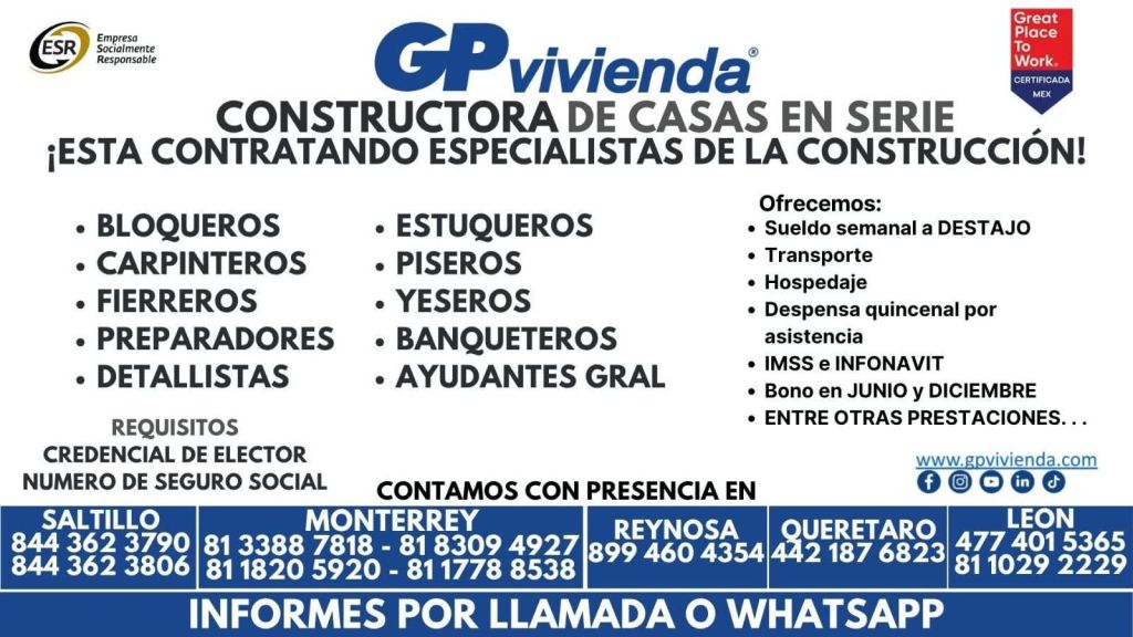 La empresa GP Vivienda, reconocida constructora de casas en serie, está contratando especialistas de la construcción 🧱🔨