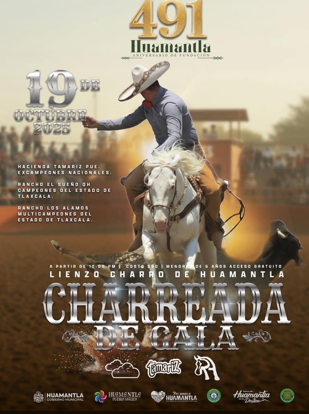 Huamantla, Tlax.- En el marco del 491 aniversario de la fundación de Huamantla, el Ayuntamiento que encabeza el presidente Salvador Santos Cedillo invita a la ciudadanía a disfrutar de una de las tradiciones más representativas del pueblo mexicano: la Charreada de Gala, que se llevará a cabo este domingo 19 de octubre a partir de las 12:00 p.m. en el Lienzo Charro de Huamantla.