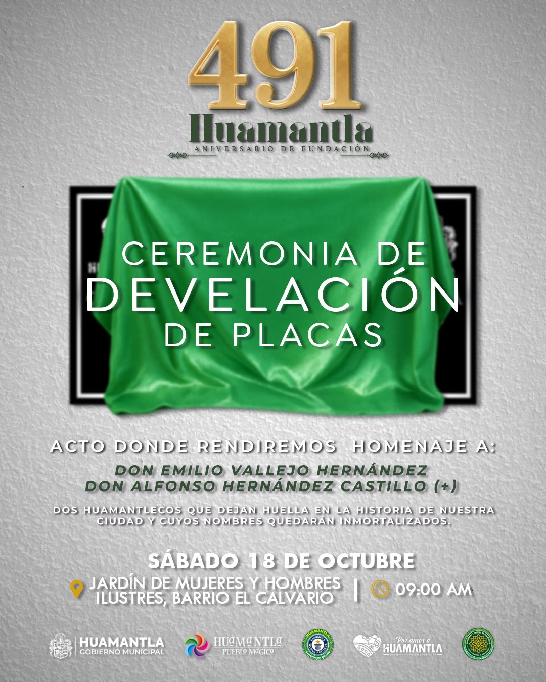 Huamantla, Tlax.- Como parte del bando solemne de actividades conmemorativas por el 491 aniversario de la fundación de Huamantla, el H. Ayuntamiento, encabezado por el presidente municipal Salvador Santos Cedillo, invita a la ciudadanía a la develación de placas en homenaje a Don Emilio Vallejo Hernández y Don Alfonso Hernández Castillo (+).