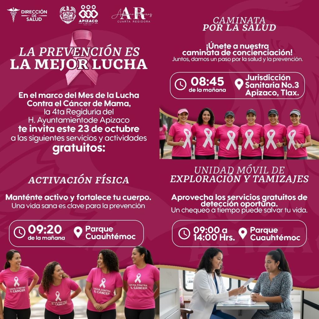 El Ayuntamiento de Apizaco, en coordinación con la Cuarta Regiduría, que encabeza Adriana Eugenia Ramírez Franco, invita a la población a participar en una serie de actividades gratuitas este 23 de octubre, en el marco del mes de la lucha contra el Cáncer de Mama.