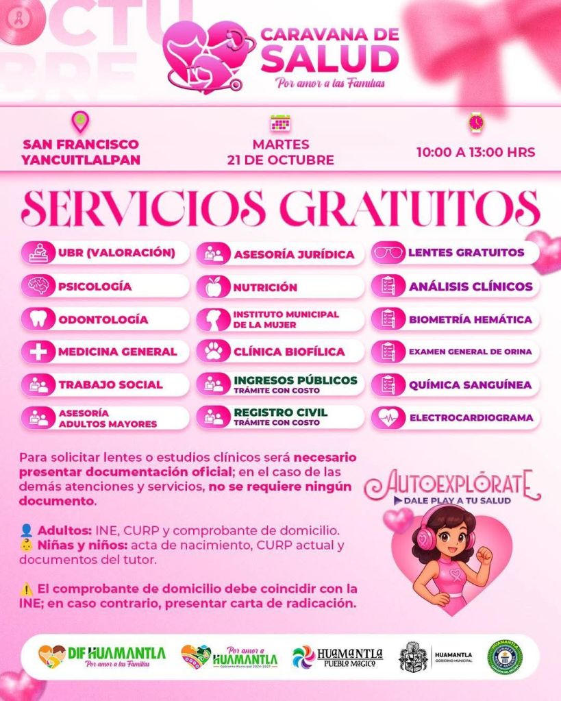 El Gobierno Municipal invita a la población de San Francisco Yancuitlalpan y comunidades cercanas a aprovechar esta jornada, que representa una oportunidad para cuidar la salud, recibir orientación profesional y fortalecer el bienestar familiar.
