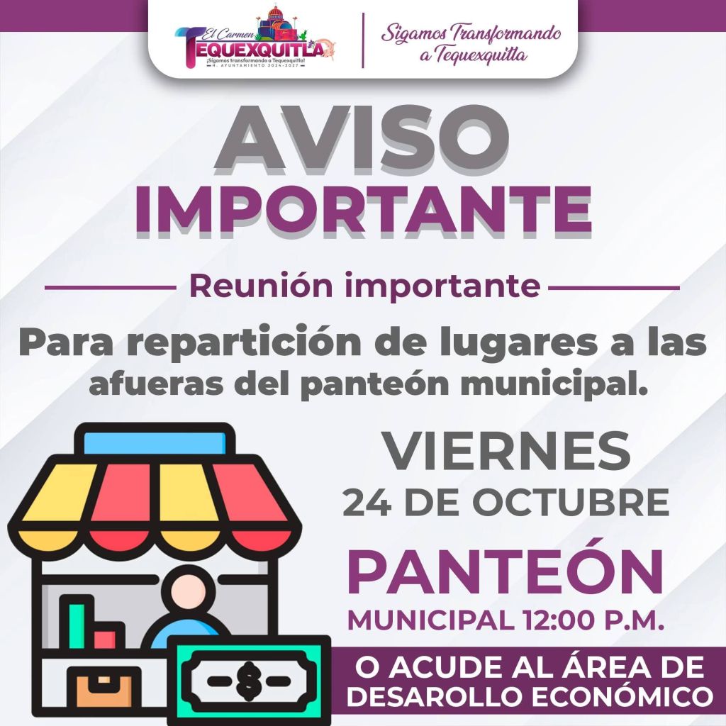 El Gobierno Municipal de El Carmen Tequexquitla informa que este viernes 24 de octubre, se llevará a cabo una reunión importante para la repartición de lugares a las afueras del Panteón Municipal para venta de flores y demás artículos de todos santos. 🪦📋