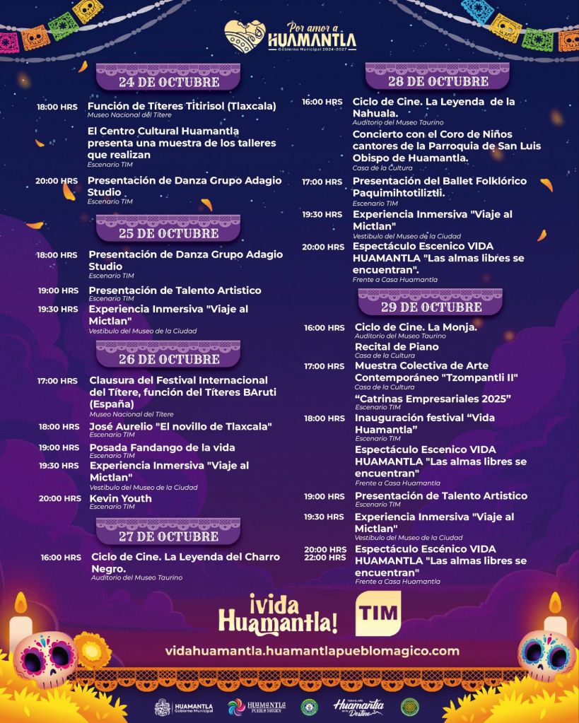 Huamantla, Tlax.– Del 25 de octubre al 2 de noviembre, el municipio de Huamantla vivirá una de sus celebraciones culturales más significativas: “Vida Huamantla”, un festival que reúne música, arte, tradición y sentimiento para honrar a quienes ya no están físicamente, pero que permanecen en la memoria y en el corazón de las familias huamantlecas.