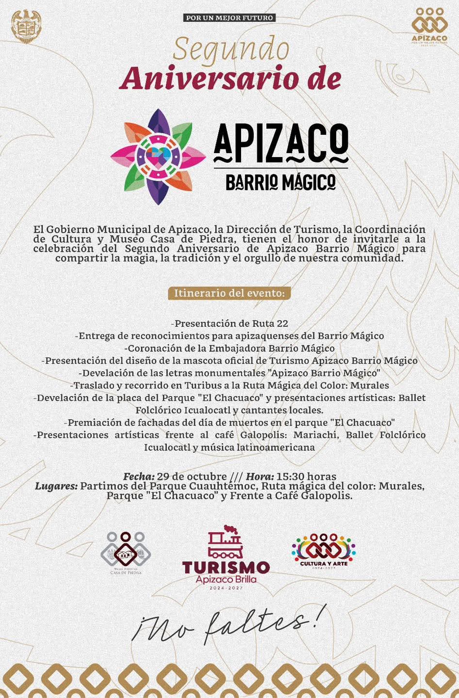 Te invitamos a celebrar con nosotros el Segundo Aniversario de Apizaco Barrio Mágico, un espacio que refleja la historia, el arte y el orgullo de nuestra gente. 💛💜