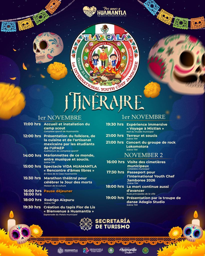 El gobierno municipal de Huamantla, que preside Salvador Santos Cedillo, dio a conocer el itinerario oficial del International Youth Chef Jamboree 2025, evento internacional del Movimiento Scout Mundial que tendrá como sede de apertura al Pueblo Mágico de Huamantla del 1 al 2 de noviembre de 2025.