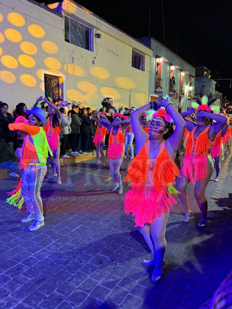 Catrinas y catrines desfilaron entre aplausos del público, acompañados de carros alegóricos, grupos de salsa, ballet folklórico, matachines, marching bands, mojigatas, zan queroseno, y bandas de guerra, que llenaron de vida las calles en honor al Día de Muertos.