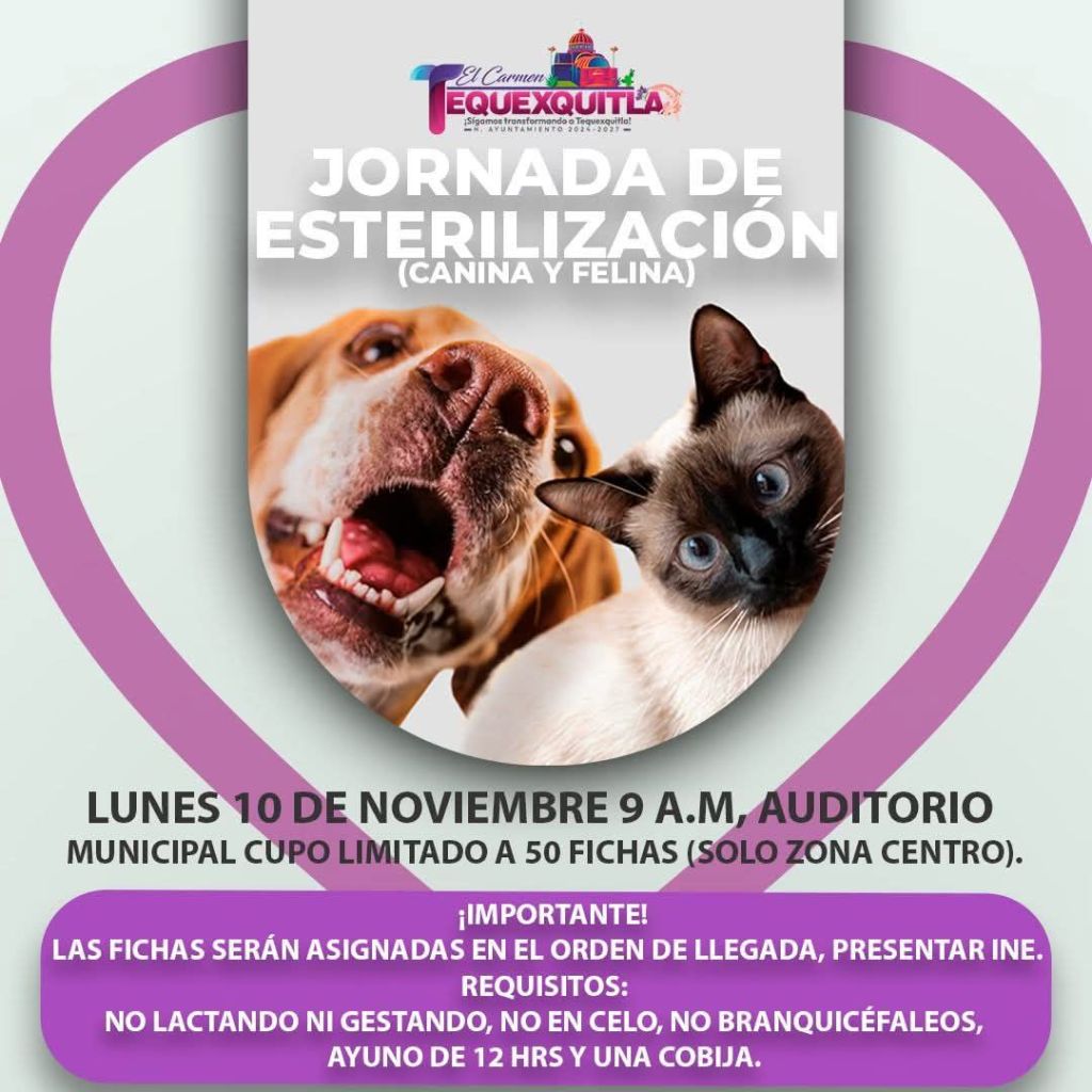 🐾 El Gobierno Municipal de El Carmen Tequexquitla, en coordinación con la Regiduría de Salud y Regiduria de Patrimonio, invita a la ciudadanía a participar en la Jornada de Esterilización Canina y Felina, que se llevará a cabo el lunes 10 de noviembre en el Auditorio Municipal.