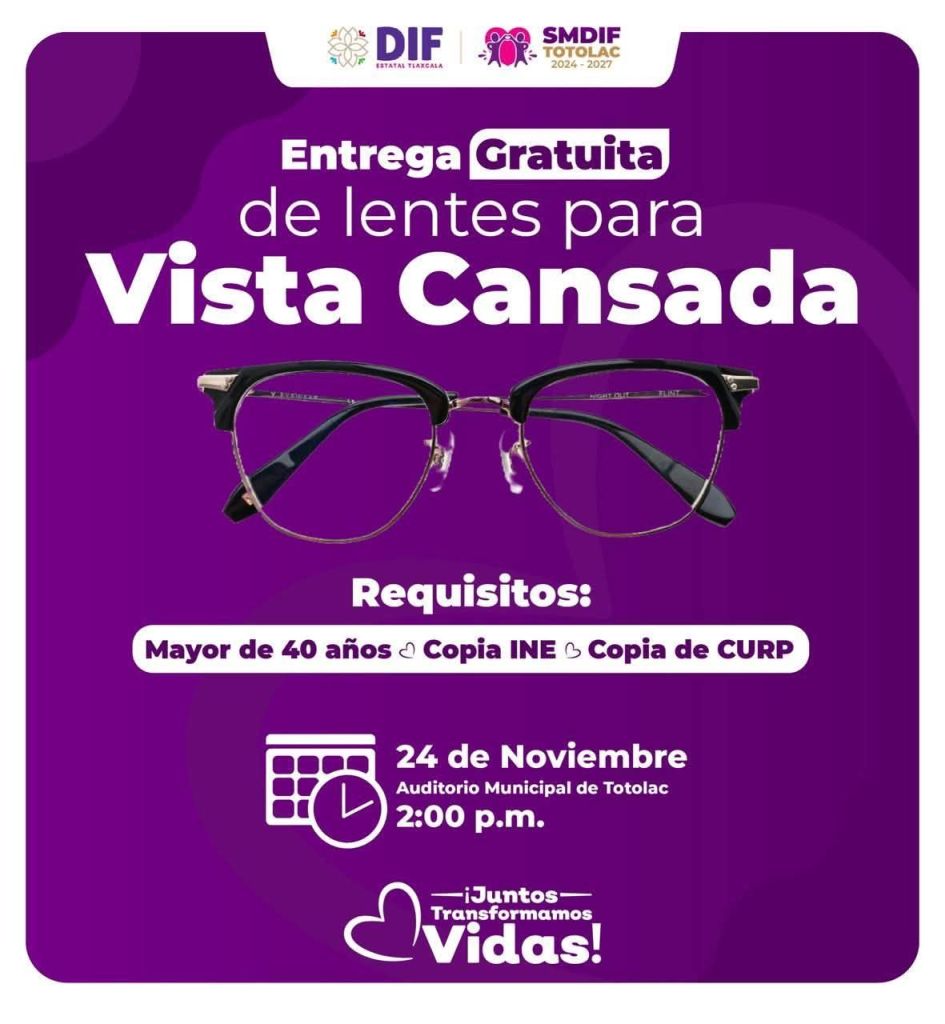 El SEDIF Tlaxcala en coordinación con el DIF Municipal Totolac ponen en marcha la «𝗘𝗻𝘁𝗿𝗲𝗴𝗮 𝗚𝗿𝗮𝘁𝘂𝗶𝘁𝗮 𝗱𝗲 𝗟𝗲𝗻𝘁𝗲𝘀 𝗽𝗮𝗿𝗮 𝗩𝗶𝘀𝘁𝗮 𝗖𝗮𝗻𝘀𝗮𝗱𝗮», a personas de 40 años y más, será el próximo 24 de noviembre a las 2:00 pm en el auditorio municipal de Totolac. 😎