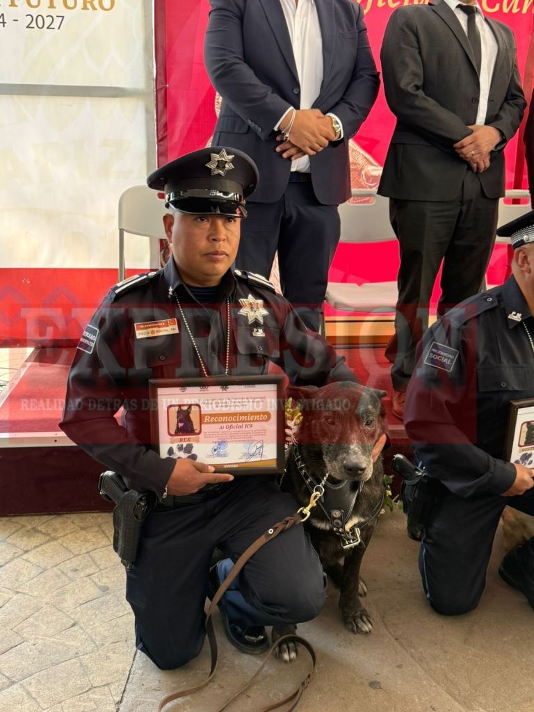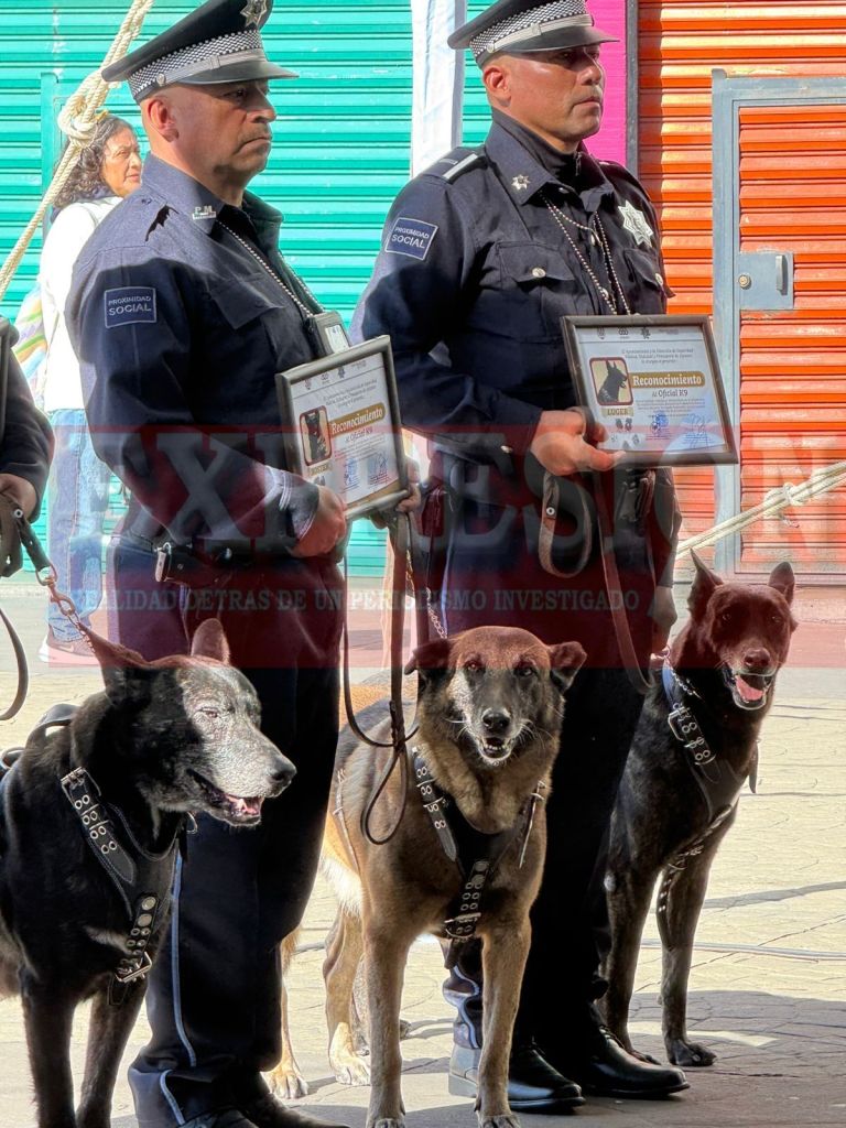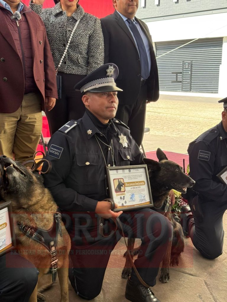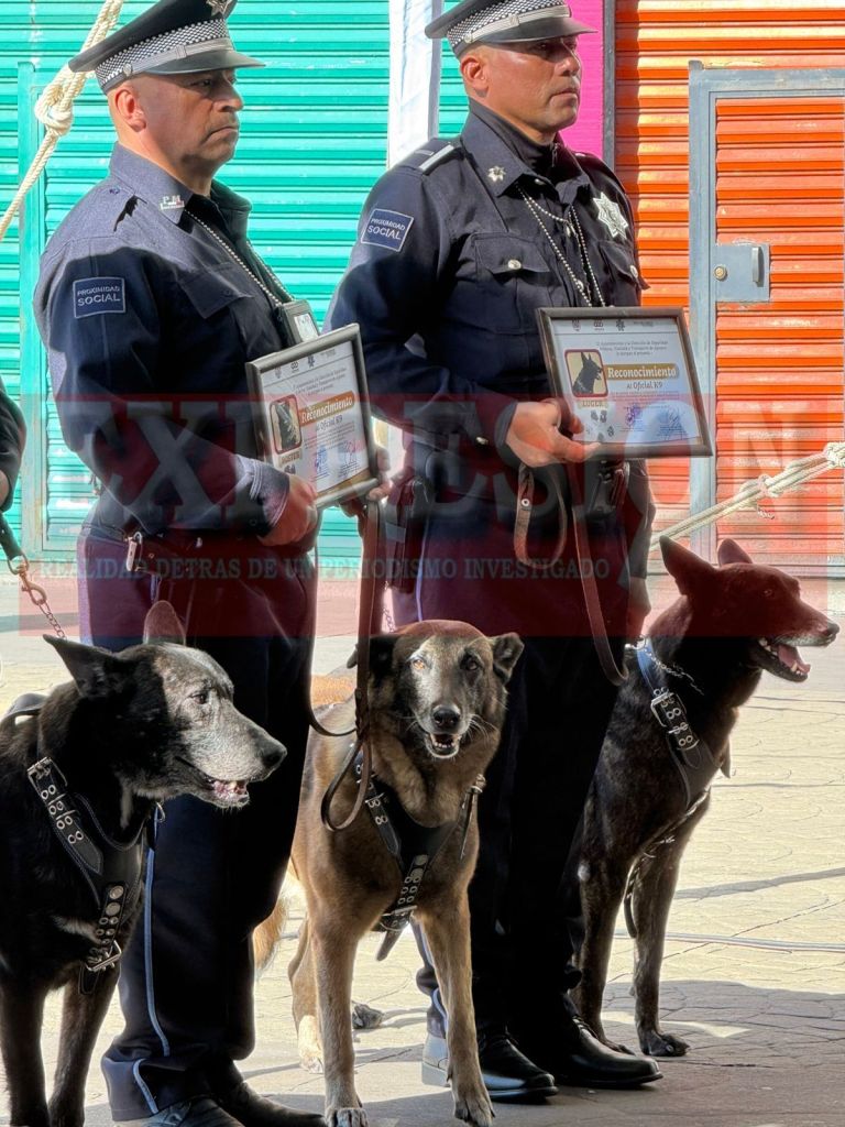 Elementos de la Policía Municipal y entrenadores estuvieron presentes para despedir a los binomios caninos, que recibieron reconocimientos por su trayectoria y aportación a la seguridad pública.