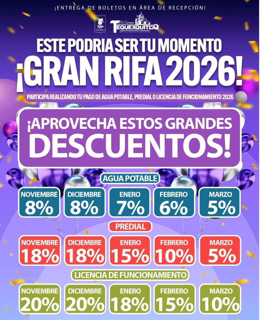 El Gobierno Municipal de El Carmen Tequexquitla te invita a participar y tener la oportunidad de llevarte increíbles premios al realizar tu pago de agua potable, predial o licencia de funcionamiento.