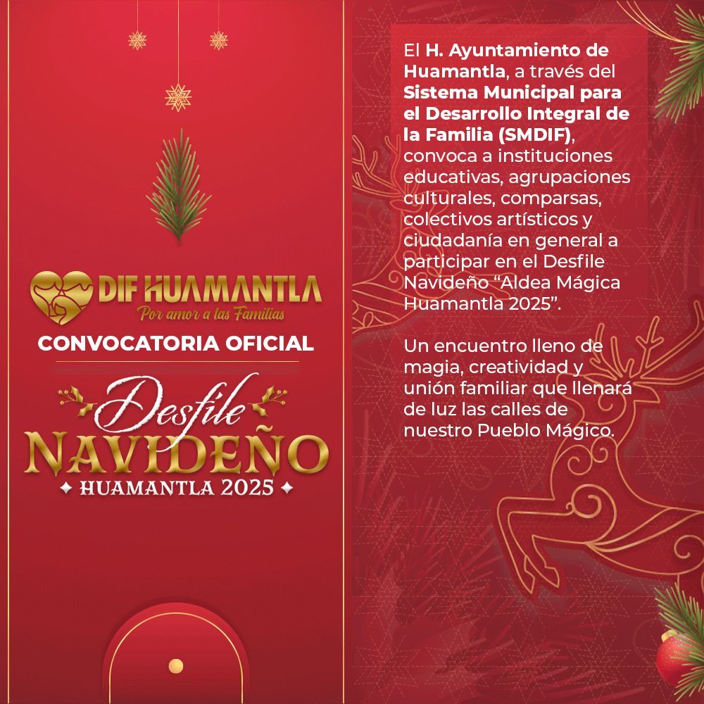 #Huamantla El Sistema Municipal para el Desarrollo Integral de la Familia (SMDIF) de Huamantla continua con la recepción de inscripciones de la convocatoria para el esperado Desfile Navideño de la Quinta Edición de Aldea Mágica 2025, que se llevará a cabo el próximo sábado 6 de diciembre, evento que busca resaltar las tradiciones locales, fomentar la creatividad, promover los valores y la identidad cultural de nuestro municipio en la temporada navideña, así como atraer turismo.