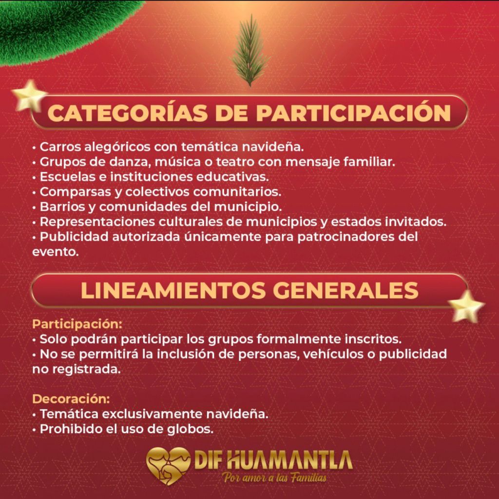 El desfile está abierto a toda la población y los interesados pueden participar en diversas categorías como carros alegóricos, grupos de danza, música o teatro con mensaje familiar, escuelas e instituciones educativas, comparsas y colectivos comunitarios, barrios y comunidades del municipio, representaciones culturales de municipios y estados invitados, así como publicidad autorizada únicamente para patrocinadores del evento. La idea es que cada grupo se exprese a través de propuestas que representen el espíritu navideño, usando diseños y vestimentas alusivas a estas fechas tan especiales.