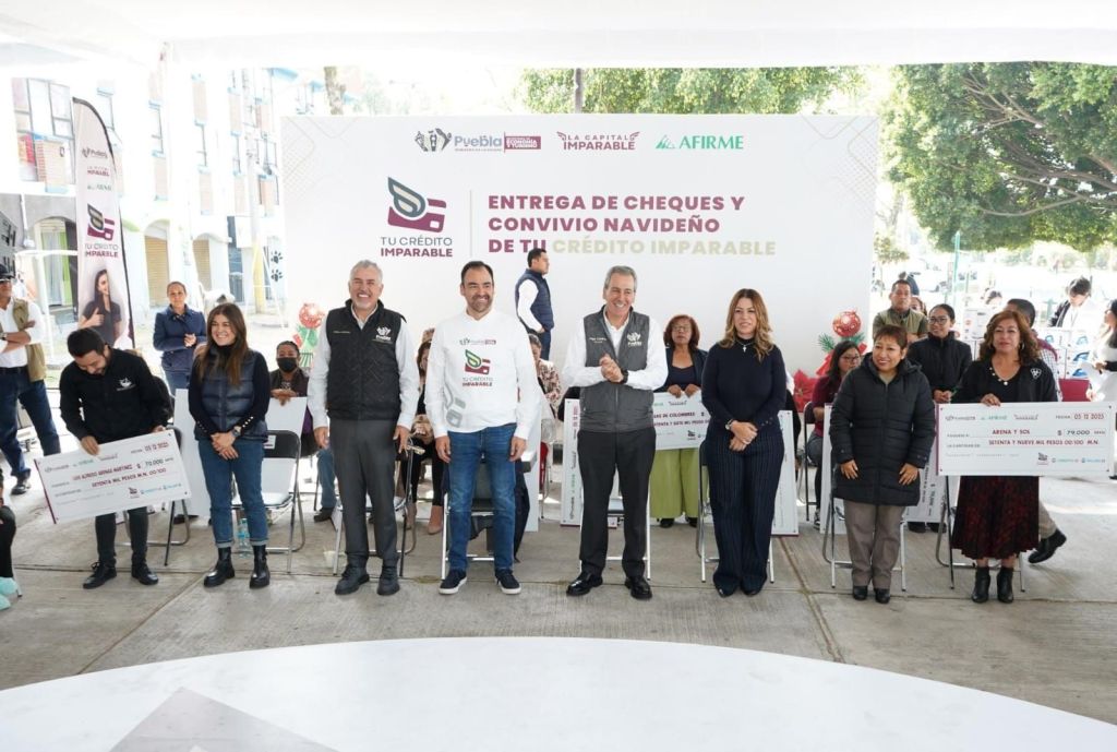Puebla, Pue., 05 de diciembre de 2025.- El presidente municipal, Pepe Chedraui Budib, encabezó la entrega de 29 cheques simbólicos correspondientes a los esquemas Tu Crédito Individual y Tu Crédito Mujer. Estos apoyos —que van de 10 mil a 149 mil pesos — se otorgan con cero por ciento de interés, ya que el Gobierno de la Ciudad absorbe el costo financiero, permitiendo que cada beneficiario pague únicamente el capital.