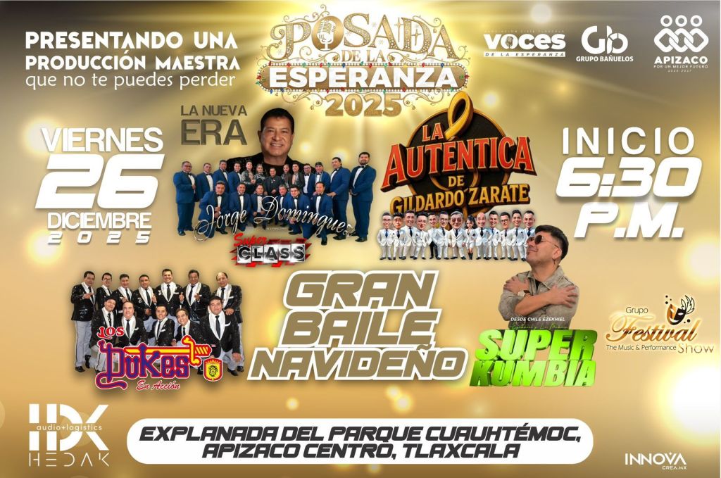 El Ayuntamiento de Apizaco, encabezado por el presidente municipal Javier Rivera Bonilla, en colaboración con la asociación civil Voces de la Esperanza Tlaxcala, invitan a todas las familias a disfrutar de la Posada de la Esperanza 2025, una celebración que reunirá música, talento y convivencia para cerrar el año con alegría.