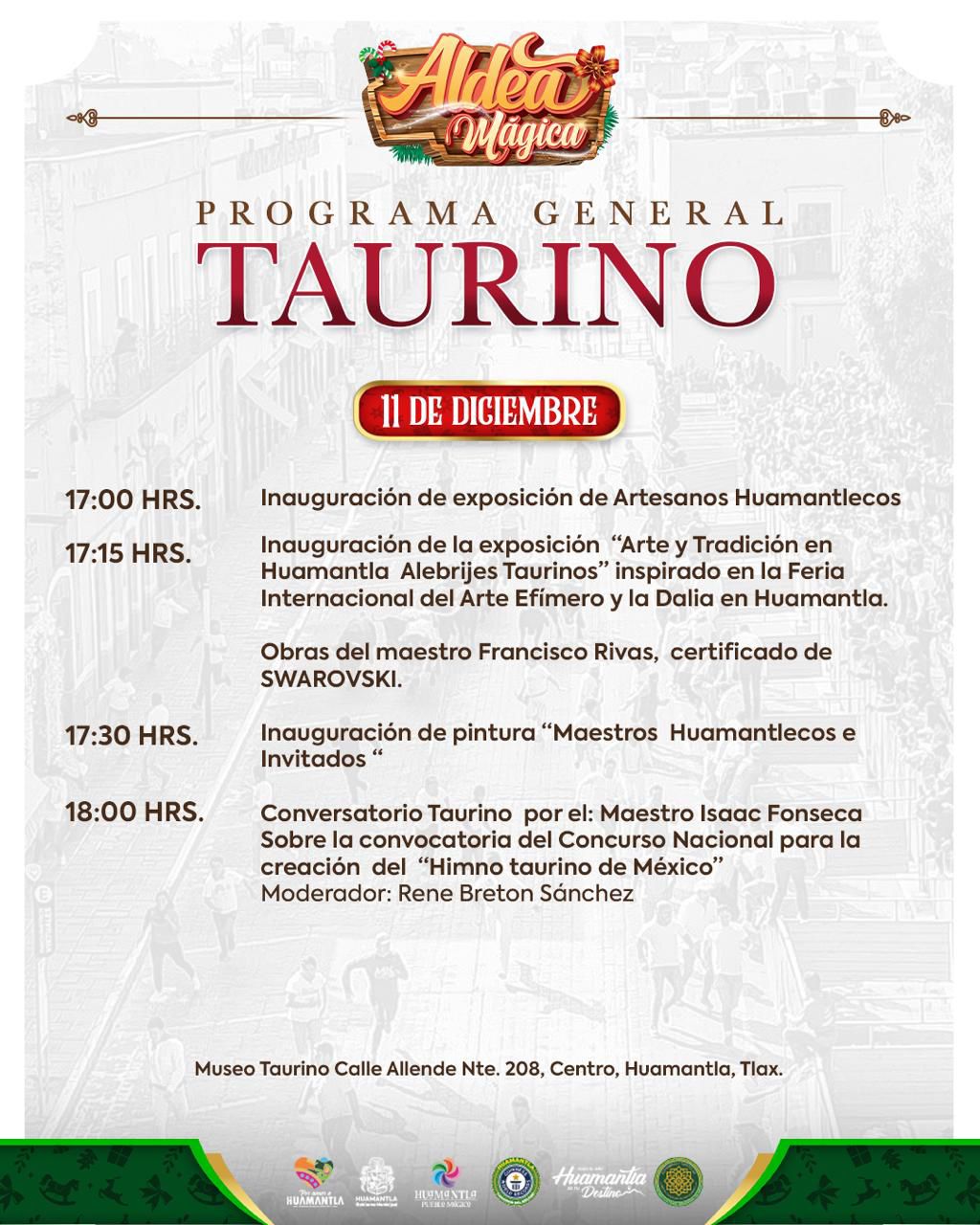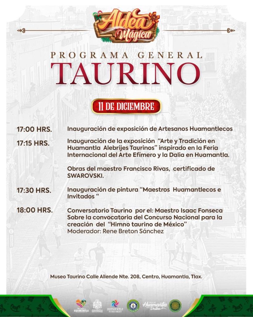 Huamantla, Tlax.— El H. Ayuntamiento de Huamantla invita a toda la ciudadanía a participar en las actividades culturales y taurinas programadas para este jueves 11 de diciembre, dentro del marco de Aldea Mágica, un espacio que destaca el talento local, la tradición y la identidad huamantleca.