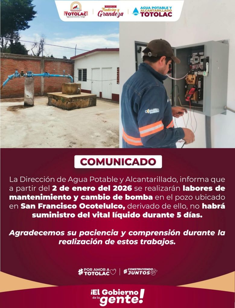 La Dirección de Agua Potable y Alcantarillado de Totolac informa a la ciudadanía que, a partir del 2 de enero, se realizarán trabajos de mantenimiento integral y sustitución de bomba en el pozo ubicado en San Francisco #Ocotelulco.