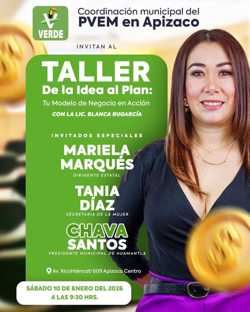 Este taller se realizará en Av. Xicohténcatl número 609, en el municipio de Apizaco, Tlaxcala, y es organizado por el Comité Municipal del Partido Verde en Apizaco, con el objetivo de brindar herramientas prácticas que contribuyan al crecimiento económico local, fomenten el emprendimiento y fortalezcan la capacitación ciudadana.
