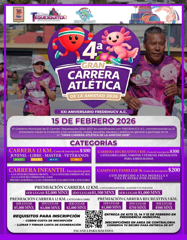 El Gobierno Municipal de El Carmen Tequexquitla 2024-2027 en conjunto con FREDEMUCV A.C., CONVOCA a todos los clubes deportivos, escuelas y población en general a registrarse en la 4.ª edición de la carrera atlética de la amistad 2026.📣♥️🔥