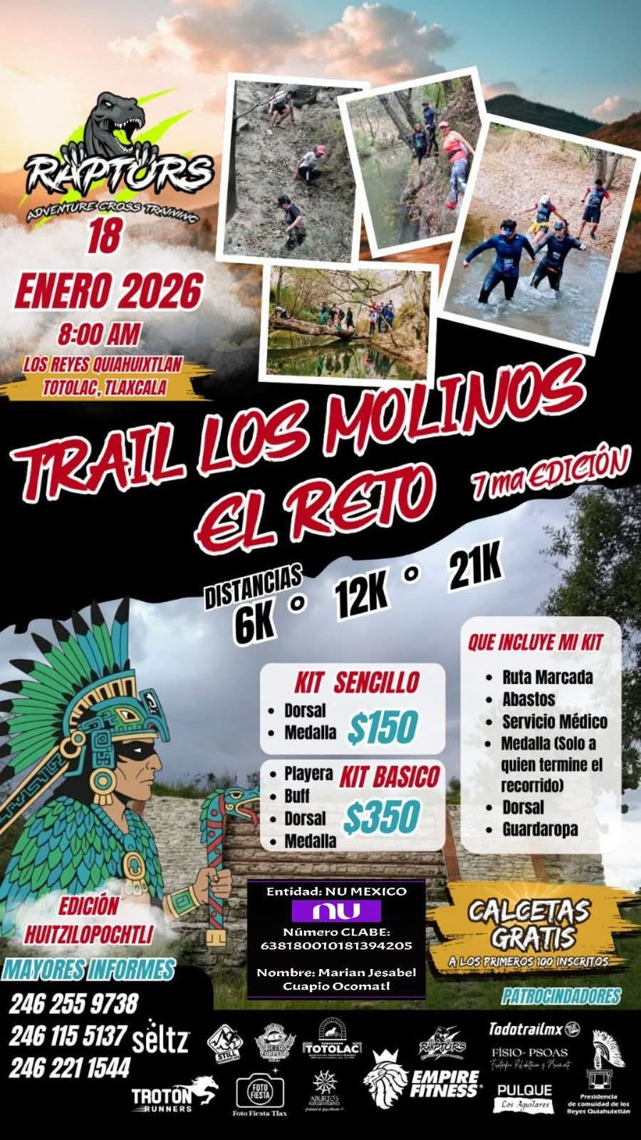 El Gobierno Municipal de Totolac 24-27 y el 𝗚𝗿𝘂𝗽𝗼 𝗥𝗮𝗽𝘁𝗼𝗿𝘀 te invitan a partir en esta espectacular experiencia deportiva «Trail Los Molinos», el próximo 𝗱𝗼𝗺𝗶𝗻𝗴𝗼 𝟭𝟴 𝗱𝗲 𝗲𝗻𝗲𝗿𝗼 𝗲𝗻 𝗽𝘂𝗻𝘁𝗼 𝗱𝗲 𝗹𝗮𝘀 𝟴:𝟬𝟬 𝗮𝗺, el punto de inicio será en frente a la Iglesia de los Reyes Quiahuixtlan.