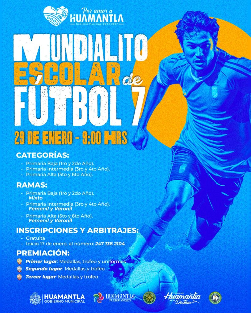#HUAMANTLA Con el objetivo de fomentar la práctica deportiva, la sana convivencia y los valores entre niñas y niños, el Gobierno Municipal de Huamantla, a través de la Coordinación de Deportes, convoca a las escuelas primarias del municipio, de las comunidades y de municipios vecinos a participar en el torneo “Mundialito Escolar de Fútbol 7”.