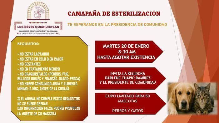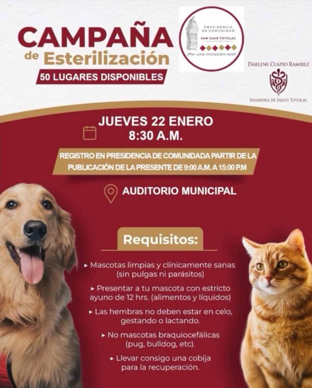 El Gobierno Municipal de Totolac 24-27 a través de la Quinta Regidora: Lic. 𝗗𝗮𝗿𝗹𝗲𝗻𝗲 𝗖𝘂𝗮𝗽𝗶𝗼 𝗥𝗮𝗺í𝗿𝗲𝘇 en coordinación con los presidentes de Comunidad de San Juan Totolac y Los Reyes Quiahuixtlan, invitan a la población a participar en la campaña de esterilización.