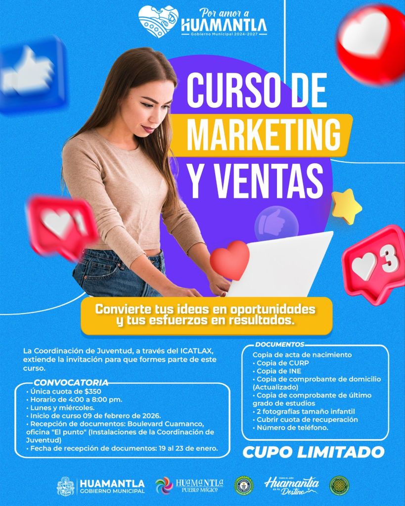 El Gobierno Municipal de Huamantla, a través de la Coordinación de Juventud y en colaboración con el ICATLAX, invita a las y los jóvenes huamantlecos a formar parte del Curso de Marketing y Ventas, una capacitación diseñada para fortalecer habilidades comerciales, impulsar proyectos personales y generar mayores oportunidades de desarrollo económico.