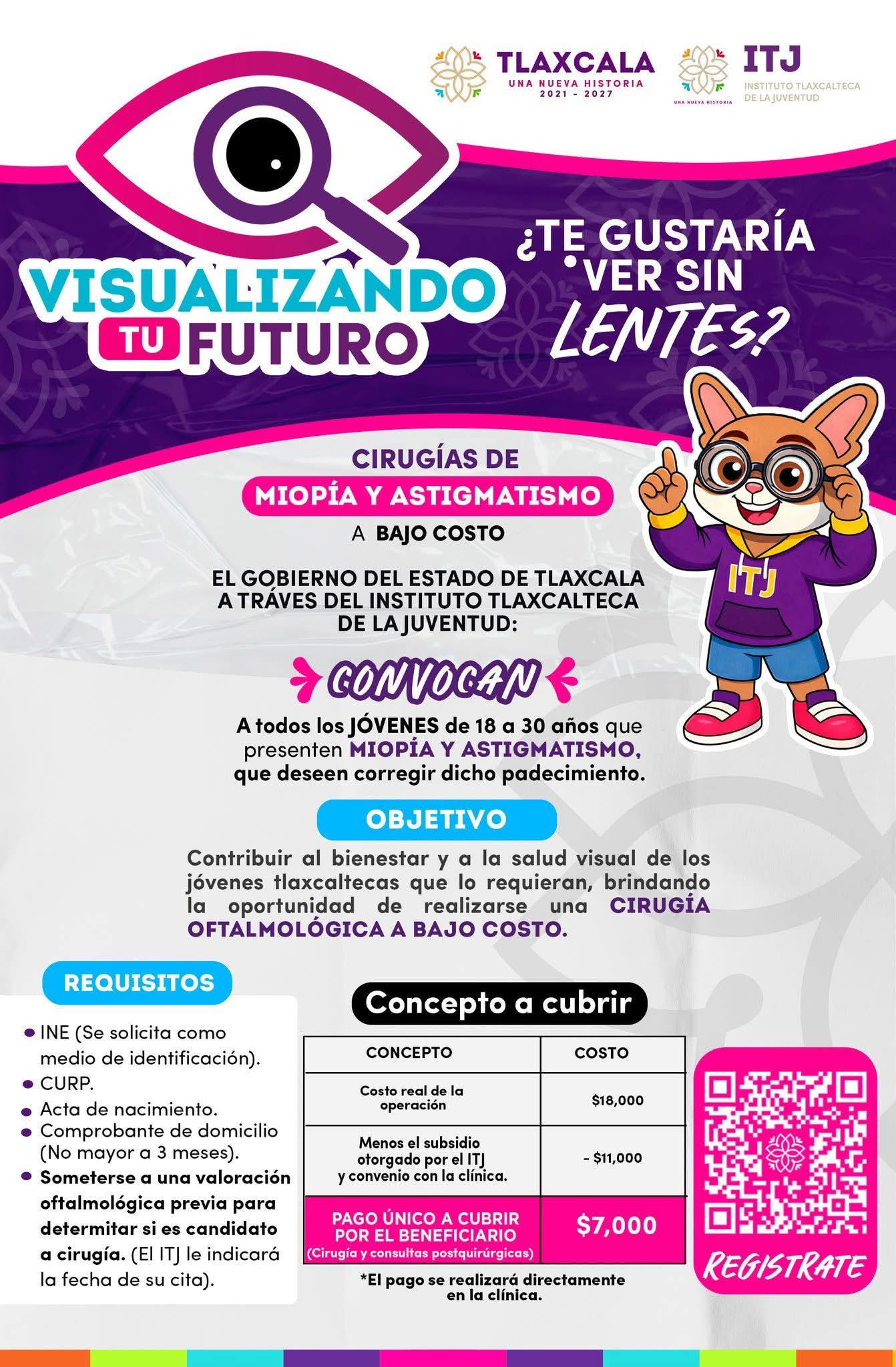 A través de la convocatoria Visualizando tu Futuro, el ITJ apoya a jóvenes de 18 a 30 años con miopía o astigmatismo y que desean mejorar su salud visual, para que puedan acceder a cirugías oftalmológicas a bajo costo.
