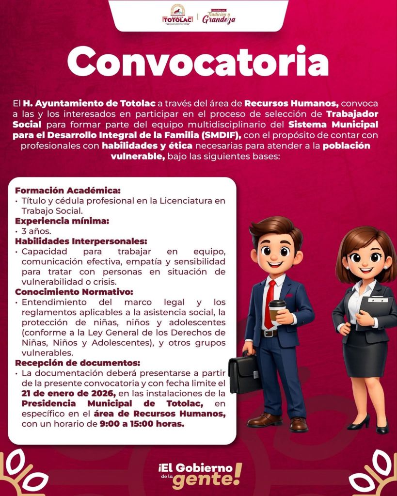 El Gobierno Municipal de Totolac 24-27 a través del área de recursos humanos realiza la siguiente convocatoria laboral. 👩🏼🎓