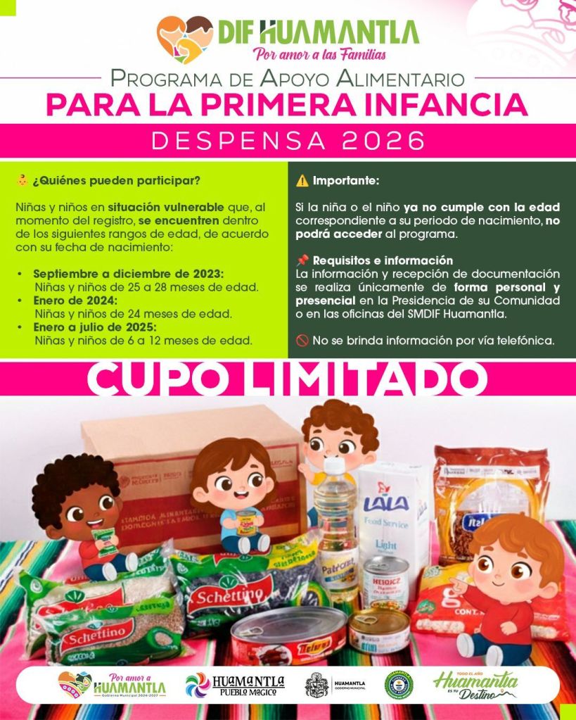 El Ayuntamiento de Huamantla, a través del Sistema Municipal DIF (SMDIF), invita a madres, padres y tutores de las 39 comunidades y la cabecera municipal a participar en el Programa de Apoyo Alimentario para la Primera Infancia, dirigido a niñas y niños en situación de vulnerabilidad.