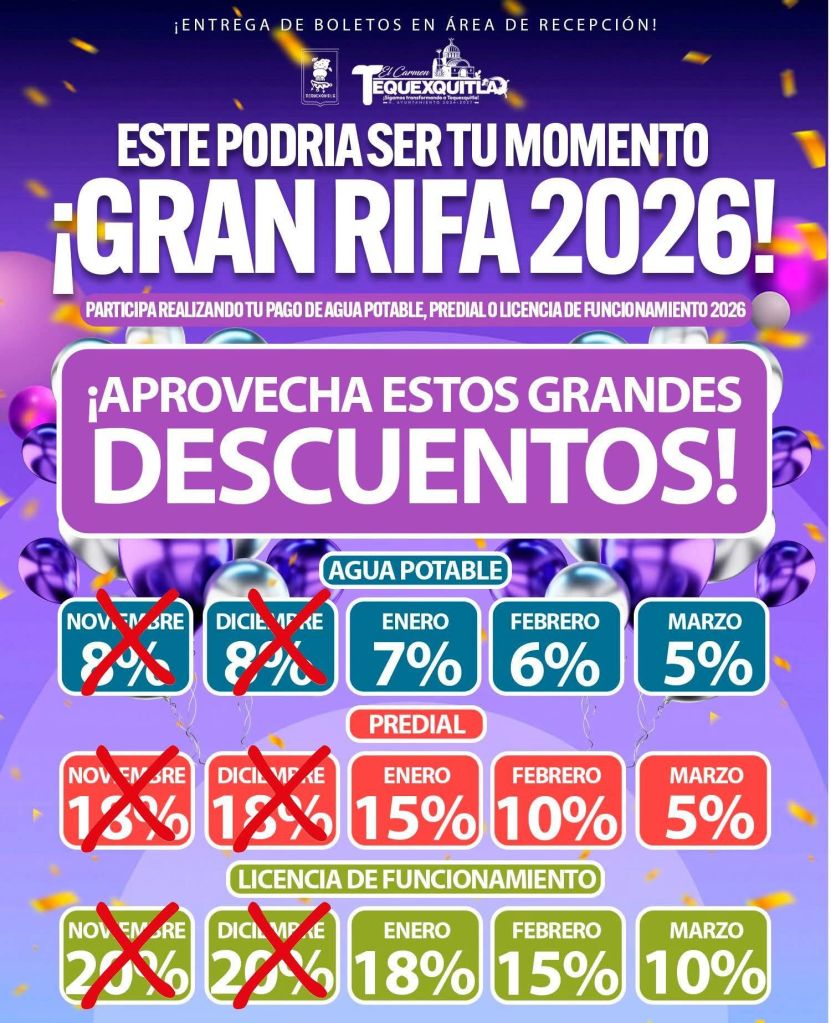 El Gobierno Municipal de El Carmen Tequexquitla te invita a participar y tener la oportunidad de llevarte increíbles premios al realizar tu pago de agua potable, predial o licencia de funcionamiento.