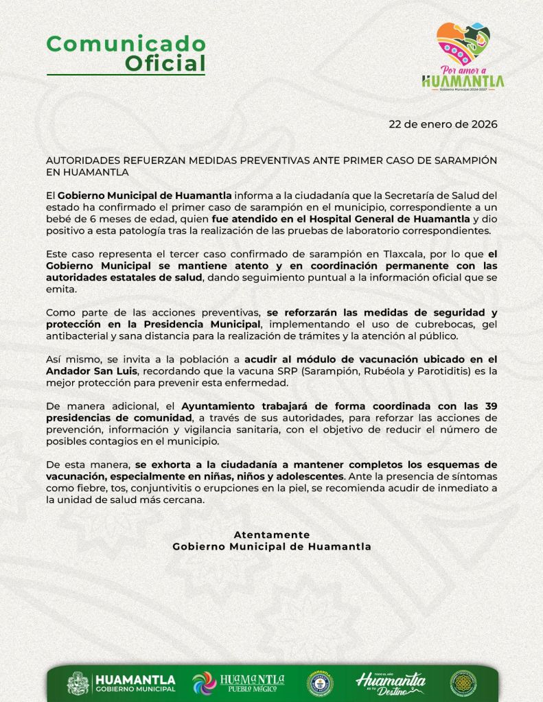 Este caso representa el tercer caso confirmado de sarampión en Tlaxcala, por lo que el Gobierno Municipal se mantiene atento y en coordinación permanente con las autoridades estatales de salud, dando seguimiento puntual a la información oficial que se emita.